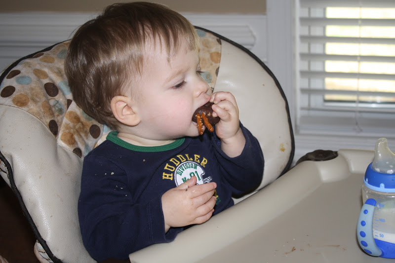 Anyway, this year we didn't make oreo spiders (that turn out wonderful and cutesy) , we made whateverwehaveinthehouse spiders (that turn out less than wonderful and cutesy). We ended up using a pack of mini chocolate doughnuts, pretzel sticks, and cherrios. Oh well. We continued the tradition, (sort of) and made memories with what we had. Garrison had fun and both boys loved the special snack they got to eat, so that's all that matters anyway I guess.