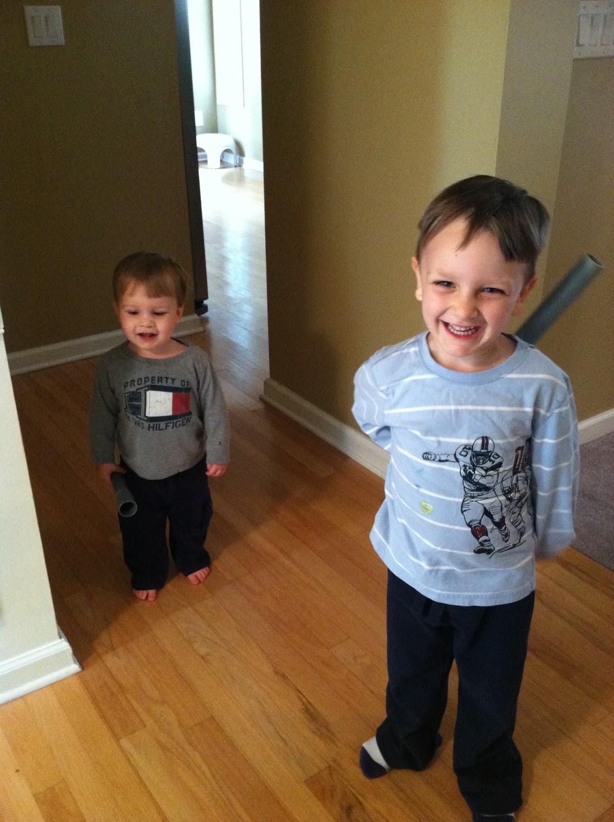 This was Friday afternoon. Baby boy bounced back quick. I vacuumed and the boys ran around with a "piece" to the vacuum. One of their favorite things to do ever.